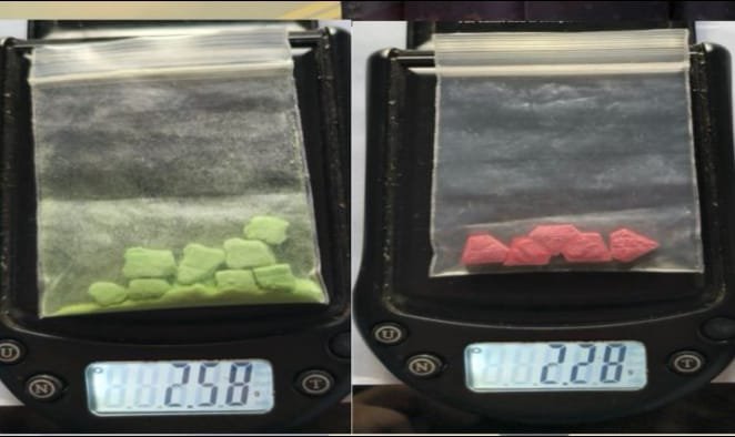Setelah diinterogasi, kedua tersangka mengakui membawa ekstasi yang disembunyikan di selipan pijakan kaki motor Honda Beat. Penggeledahan menghasilkan barang bukti berupa: